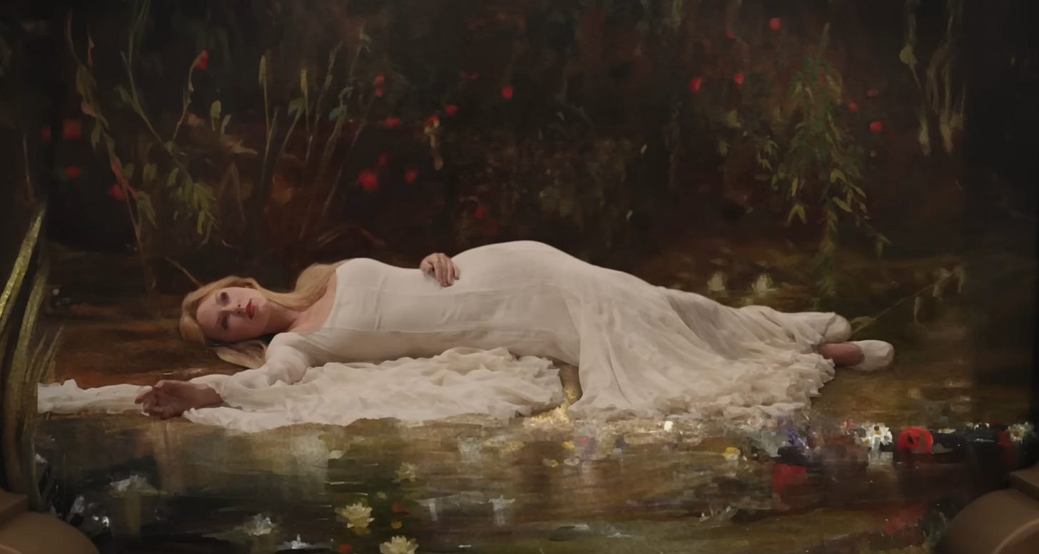 Swift reigns over her world as a child would at play. She is a chameleon, trying on characters like her younger self might have imagined herself to be—a teacher, only child, astronaut, heiress, criminal on the run—when she grew up. It recalls a child instructing their playmate, “now the bride gets left at the altar,” or “now pretend you lost your tongue, and I am the only one who can talk”, or “now we switch, and I am the orphan in a dress of rags, and you are the cruel stepmother”, or “now you open that trap door, and it leads to the Pacific Ocean.” In Swift’s world, she can swim in martini glasses, move through time, break down the walls of her house completely, and float in galactic anti-gravity. She is blonde, brunette, red-headed; a child, an old woman; a monster, an angel—all in the span of three minutes and thirty seconds. She steps into Jane Austen novels, famous oil paintings, and classic movies. One moment she is a widowed heiress on the rocky cliffs of Newport. The next she is in love with the likes of the prince, Scott Eastwood, the football captain, Post Malone, the boy next door.